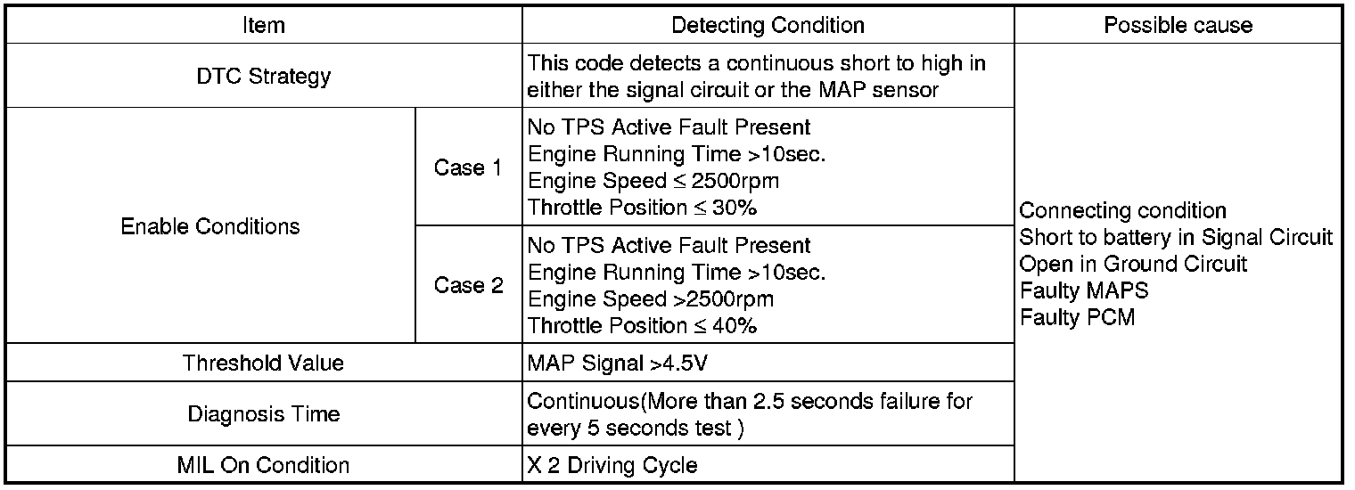 Checking output signals of MAPS every 5 sec. under detecting condition, if an output signal is above 4.5 V for more than 2.5 sec., PCM sets P0108. MIL (Malfunction Indication Lamp) turns on when the malfunction lasts till consecutive 2 driving cycle.