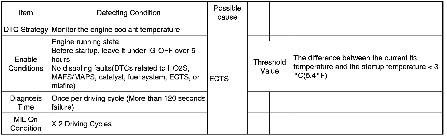 Checking the engine coolant temperature under detecting condition, if if the difference between its current temperature and startup temperature is less than threshold value over predeterminated period, PCM sets P0115. MIL (Malfunction Indication Lamp) turns on when the malfunction lasts till consecutive 2 driving cycle.