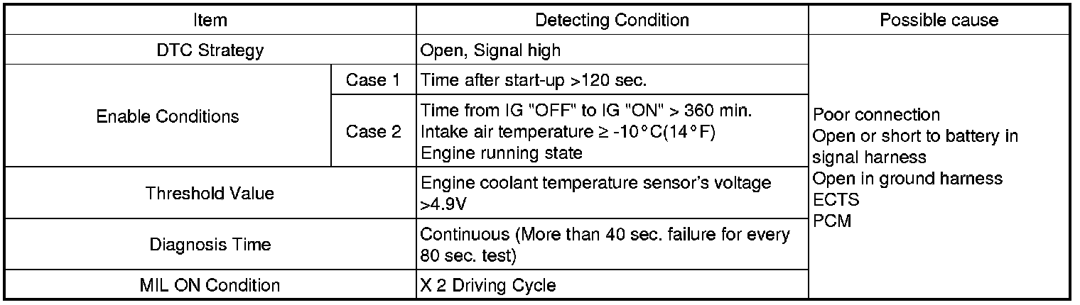 Checking output signals from ECTS every 80 sec. under detecting condition, if an output signal is above 4.9 V for more than 40 sec., PCM sets P0118. MIL (Malfunction Indication Lamp) turns on when the malfunction lasts till consecutive 2 driving cycle.