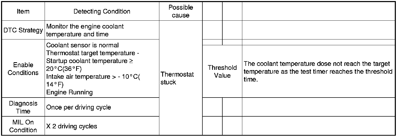 Checking time and coolant temperature under detecting condition, if the coolant temperature dose not reach the target temperature as the test timer reaches the threshold time, PCM sets P0128. MIL (Malfunction Indication Lamp) turns on when the malfunction lasts till consecutive 2 driving cycle.