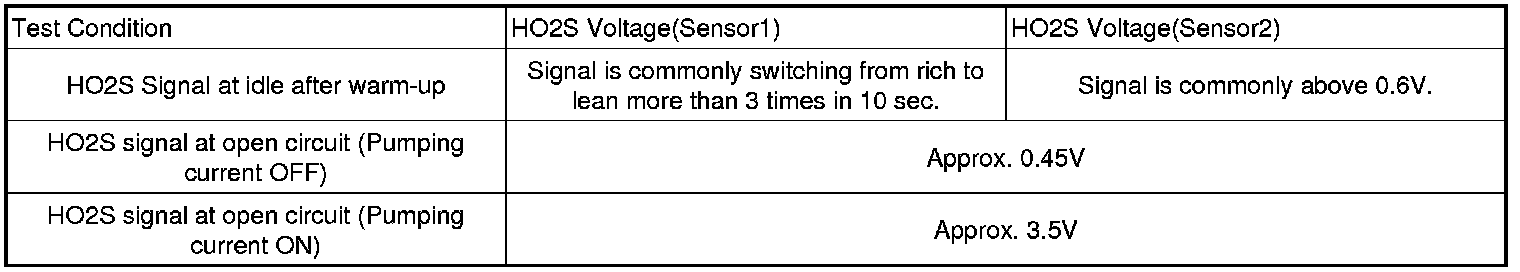 After warming-up, if accelerator pedal is released suddenly around 4000 rpm, the HO2S signal reading will be lower than 200mV resulting from Fuel cut-off for the moment. Conversely, if suddenly accelerator pedal is depressed, HO2S signal reading will be around 0.6 V ~1.0 V. At idle, Normally HO2S signal will switch from lean to rich with 3 Hz. And as racing, Its frequency rises.