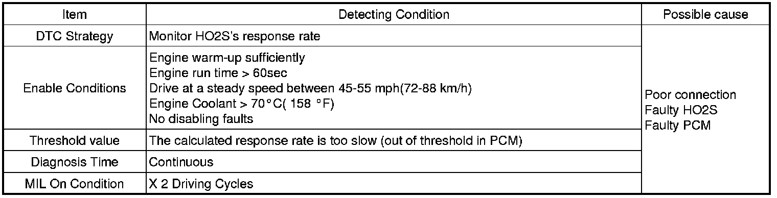 Checking output signals from HO2S under detecting condition, if PCM judges it's signals too slow, PCM sets P0153. MIL (Malfunction Indication Lamp) turns on when the malfunction lasts till consecutive 2 driving cycle.