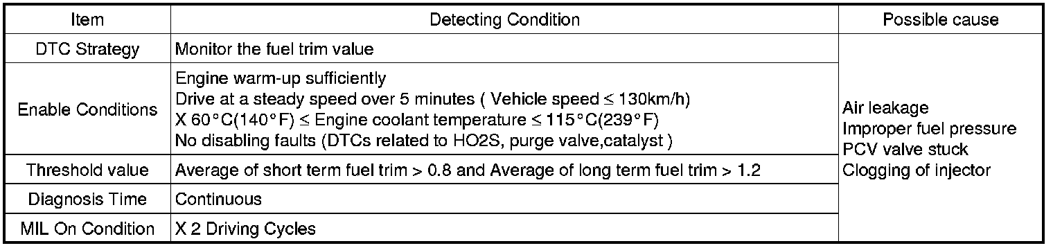 Checking the fuel time value under detecting condition, if its average exceeds the limit over certain period, PCM sets P0174. MIL (Malfunction Indication Lamp) turns on when the malfunction lasts till consecutive 2 driving cycle.