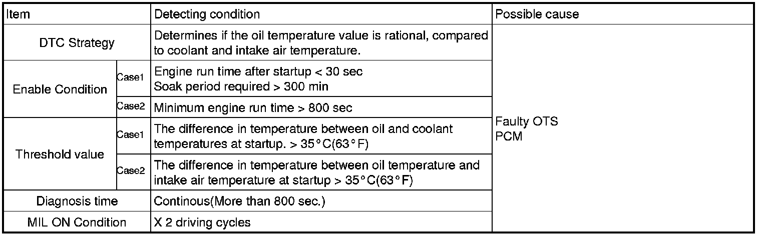 Checking the oil temperature, coolant temperature and intake air temperature every 25 sec. under detecting condition, if the difference in temperature at start-up exceeds threshold value, PCM sets P0196. MIL (Malfunction Indicating Lamp) turns on when the malfunction lasts till consecutive 2 driving cycle.