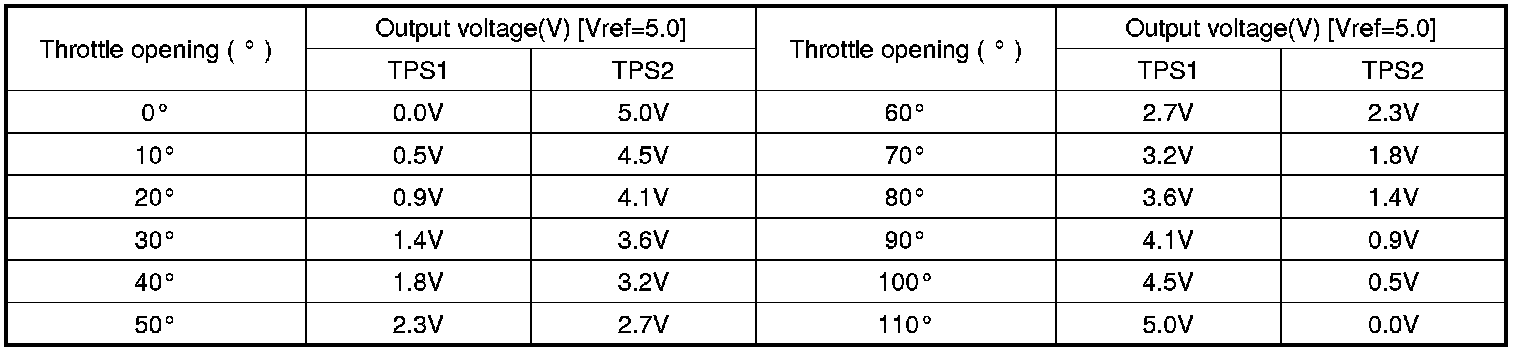 The Electronic Throttle Control (ETC) system is made of the components throttle body, Throttle Position Sensor (TPS)1&2 and Accelerator Position Sensor (APS) 1&2. TPS 1&2 are sharing the same source voltage and ground.The throttle valve opening is control by throttle motor which is controlled by PCM. The opposite position indicator shows inverted signal characteristics.TPS 1 output voltage increases smoothly in proportion with the throttle valve opening angle after starting. TPS 2 output voltage decreases in inverse proportion with the throttle valve opening angle after starting. TPS provides feedback to the PCM to control the throttle motor in order to control the throttle valve opening angle properly in response to the driving condition.
