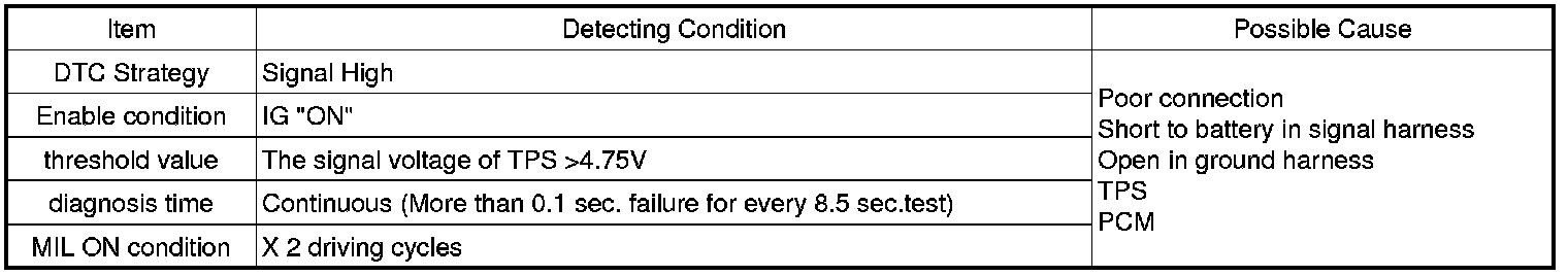 Checking output signals from TPS 2 every 8.5 sec. under detecting condition, if an output signal is above 4.75 V for more than 0.1 sec., PCM sets P0223. MIL (Malfunction Indication Lamp) turns on when the malfunction lasts till consecutive 2 driving cycle.