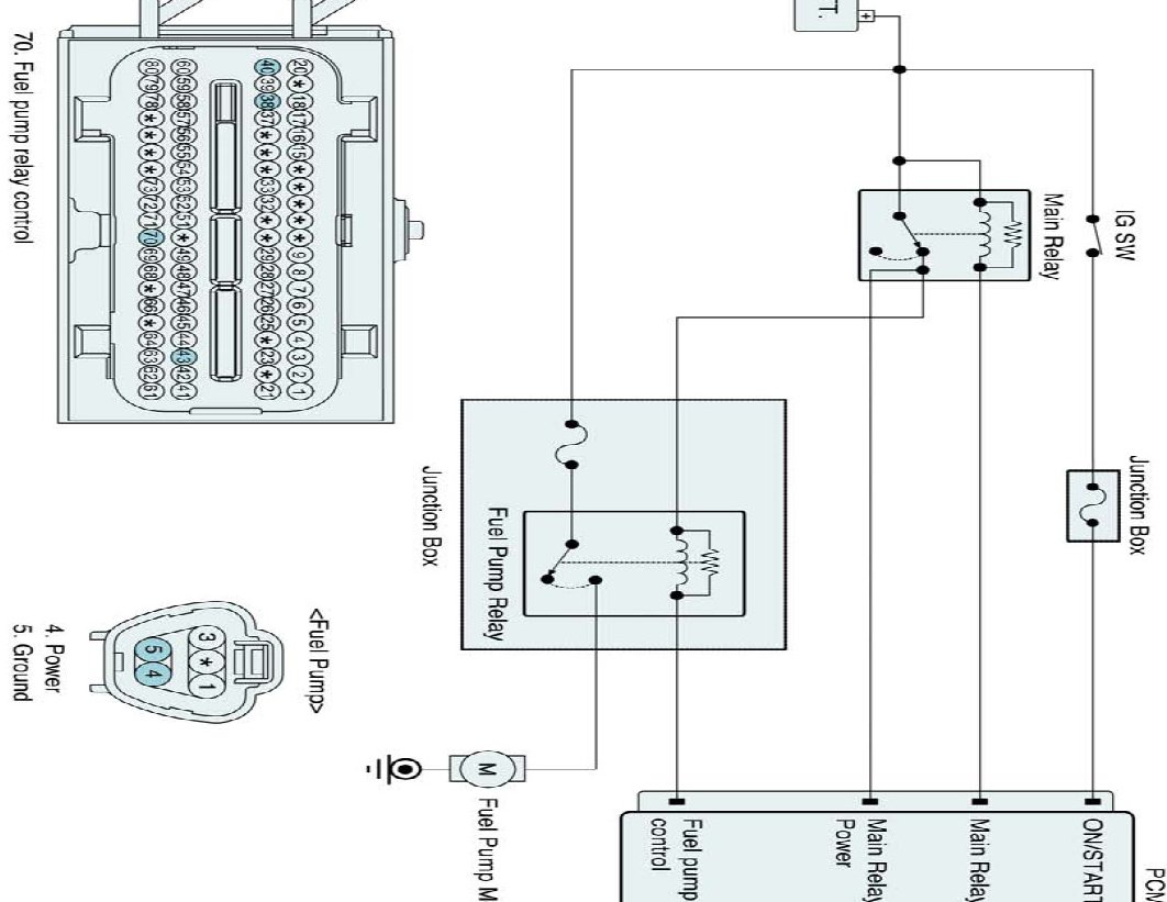 The PCM provides ground to one side of the coil in the fuel pump relay to control the fuel pump relay. The other side of the fuel pump relay coil is connected to main relay, which activates when the ignition switch is ON. The PCM monitors the control circuit between the fuel pump relay and the PCM. When the ignition switch is turned ON, the PCM energizes the fuel pump relay, which sends power to the fuel pump.