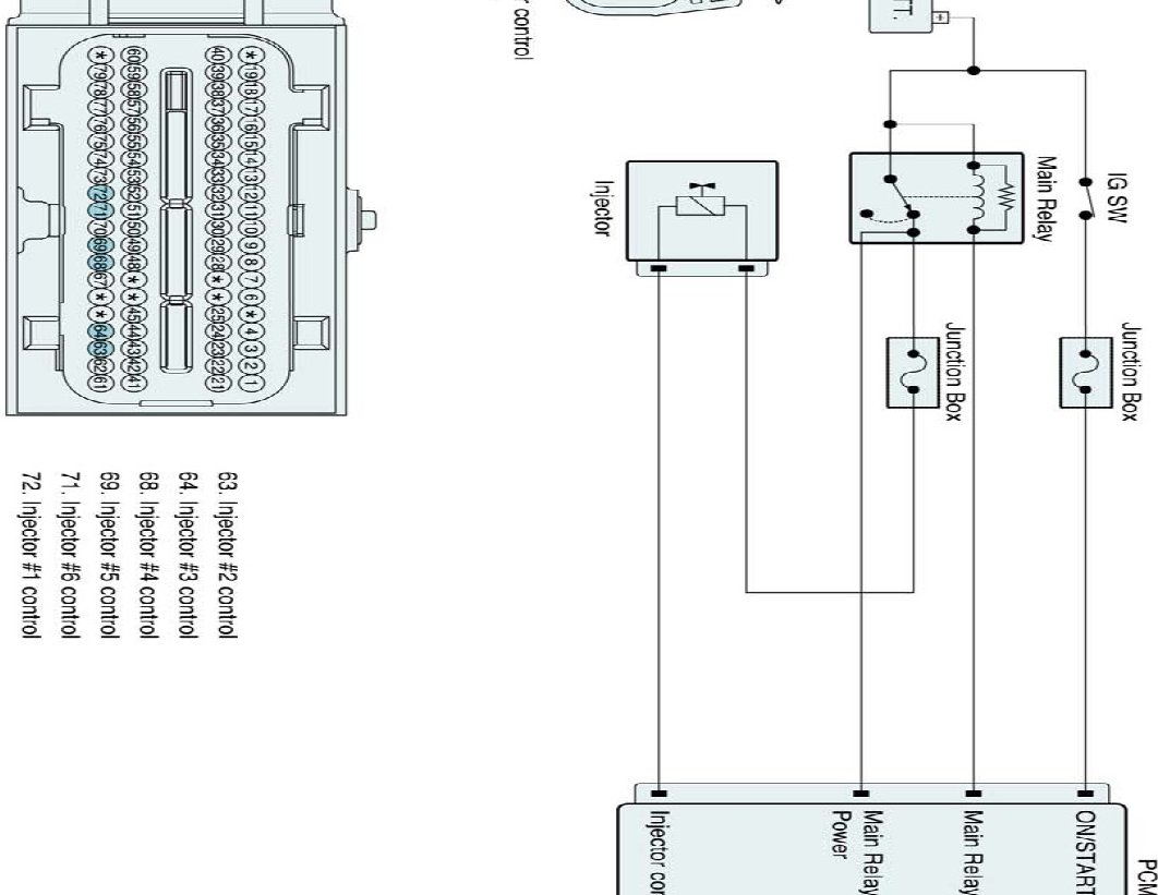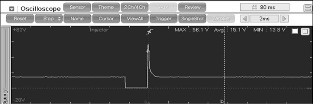 Based on information from various sensors, the PCM measures the fuel injection amount. The fuel injector is a solenoid-operated valve and the fuel injection amount is controlled by length of time the fuel injector is held open. The PCM controls each injector by grounding the control circuit. When the PCM energizes the injector by grounding the control circuit, the circuit voltage should be low (theoretically 0 V) and the fuel is injected. When the PCM de-energizes the injector by opening the control circuit, the fuel injector is closed and circuit voltage should momentarily peak.