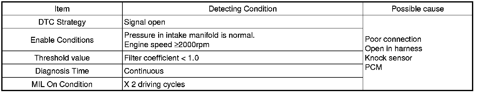Checking the range of input signal with a knock sensor under detecting condition, PCM senses open in knock sensor circuit or malfunction of sensor. If a knock signal or noise level is inputted without the specified value during standard duration, PCM sets P0330.