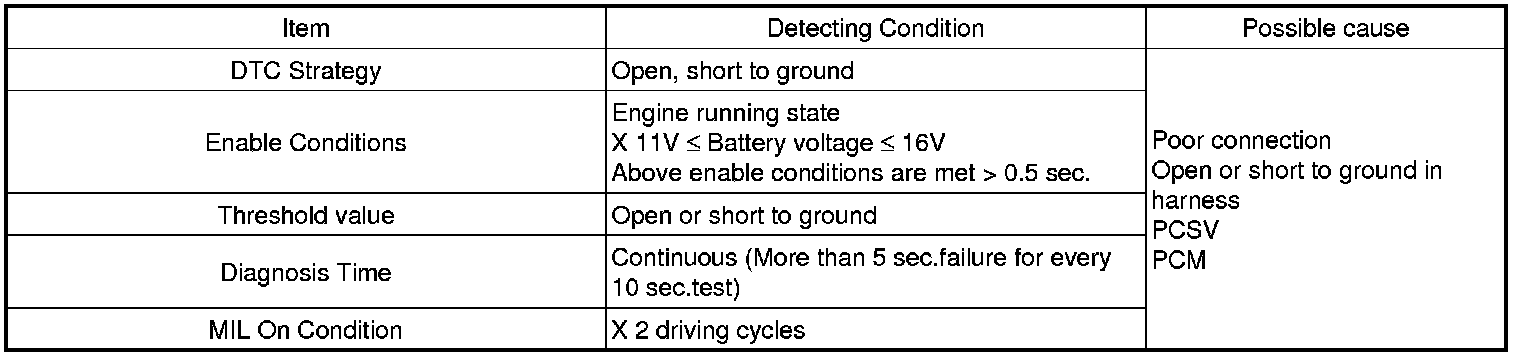 Checking output signals from PCSV every 10 sec. under detecting condition, if signals indicating open or short to ground in the circuit are detected for more than 5 sec., PCM sets P0444. MIL (Malfunction Indication Lamp) turns on when the malfunction lasts till consecutive 2 driving cycle.