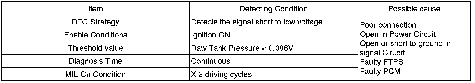 Checking output signals of fuel tank pressure sensor under detecting condition, if the tank pressure is lower than threshold, PCM sets P0452. MIL (Malfunction Indication Lamp) turns on when the malfunction lasts till consecutive 2 driving cycle.