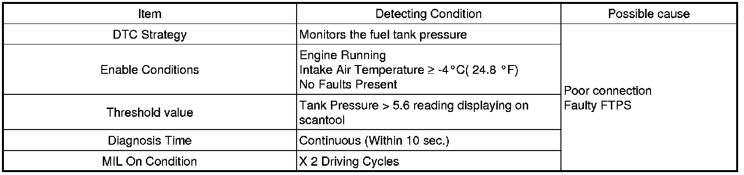 Checking output signals from FTPS under detecting condition, if the FTPS indicates pressure momentarily increased more than 5.6 reading displaying on scantool, PCM sets P0454. MIL (Malfunction Indication Lamp) turns on when the malfunction lasts till consecutive 2 driving cycle.