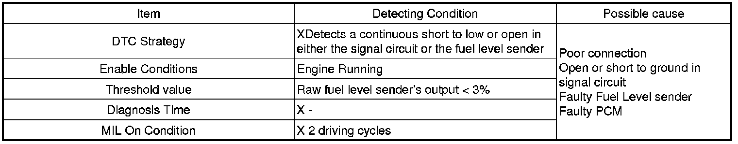Checking output signals of fuel level sender under detecting condition, if the fuel level sender's signal is low than 3%, PCM sets P0462. MIL (Malfunction Indication Lamp) turns on when the malfunction lasts till consecutive 2 driving cycle.
