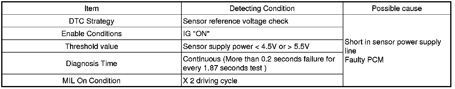 Checking the voltage from sensor power supply every 1.87 sec. under detecting condition, if the value within detecting condition lasts for more than 0.2 sec., PCM sets P0641. MIL (Malfunction Indication Lamp) turns on when the malfunction lasts till consecutive 2 driving cycle.