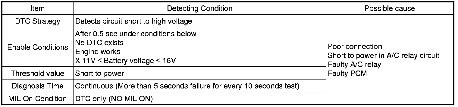 PCM monitors inputted voltage through A/C compressor relay. Checking voltage every 10 sec. under detecting condition, if the voltage higher than the specified value is detected for more than 5 sec., PCM sets P0647.