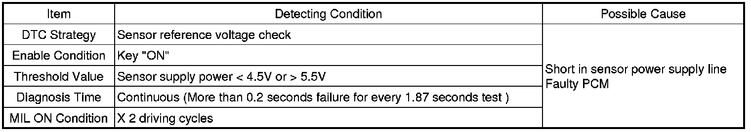 Checking the voltage from sensor power supply every 1.87 sec. under detecting condition, if the value within detecting condition lasts for more than 0.2 sec., PCM sets P0651. MIL (Malfunction Indication Lamp) turns on when the malfunction lasts till consecutive 2 driving cycle.
