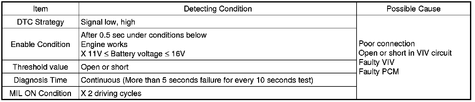 Checking the output voltage from VIV (Variable Intake Manifold Valve) every 10 sec. under detecting condition, if the value within detecting condition lasts for more than 5 sec., PCM sets P0660. MIL (Malfunction Indication Lamp) turns on when the malfunction lasts till consecutive 2 driving cycle.