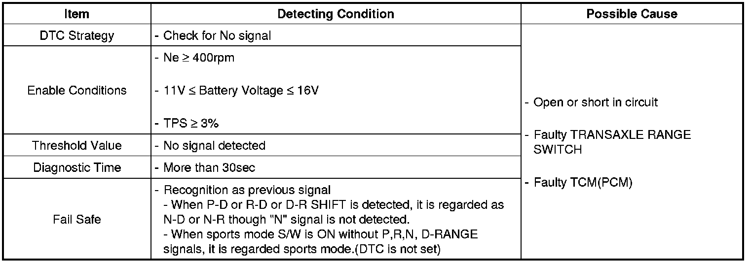 The TCM (PCM) sets this code when the Transaxle Range Switch has no output signal for more than 30 seconds.