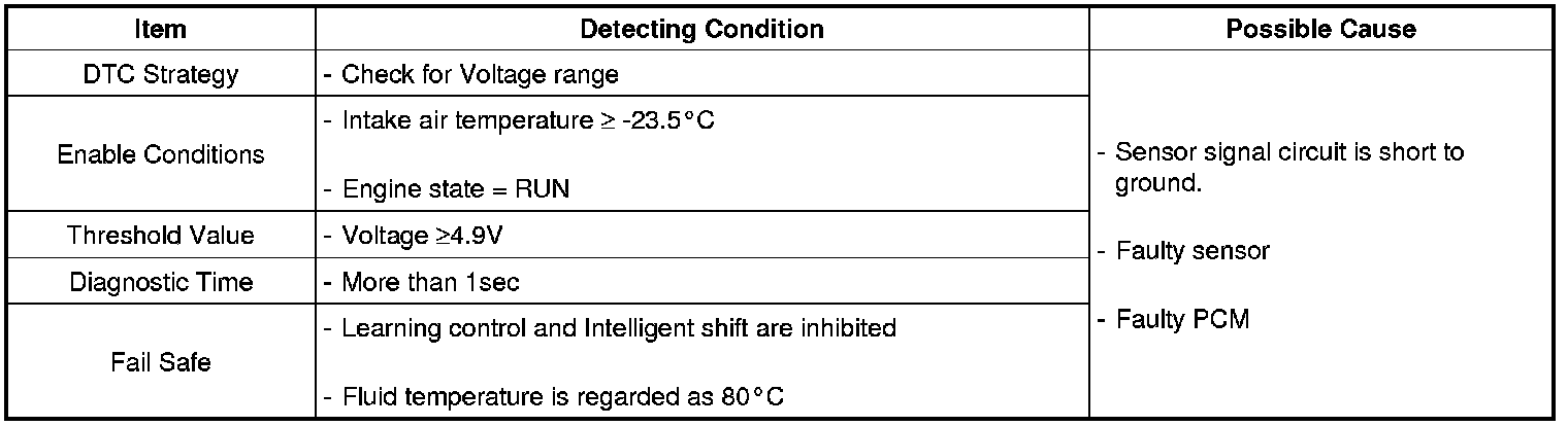 This DTC code is set when the ATF temperature output voltage is higher than a value generated by thermistor resistance, in a normal operating range, for an extended period of time. The TCM regards the ATF temperature as fixed at a value of 80 °C.