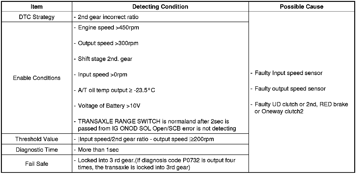 This code is set if the value of input shaft speed is not equal to the value of the output shaft, when multiplied by the 2nd gear ratio, while the transaxle is engaged in 2nd gear. This malfunction is mainly caused by mechanical troubles such as control valve sticking or solenoid valve malfunctioning rather than an electrical issue.