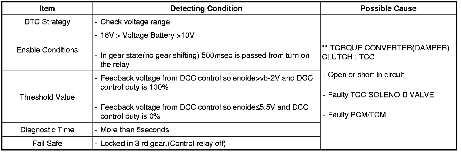 The PCM/PCM/TCM controls the locking and unlocking of the Torque Converter Clutch (or Damper Clutch), to the input shaft of the transmission, by applying hydraulic pressure. The main purpose of T/C clutch control is to save fuel by decreasing the hydraulic load inside the T/C. The PCM/PCM/TCM outputs duty pulses to control the Damper Clutch Control Solenoid Valve (DCCSV) and hydraulic pressure is applied to the DC according to the DCC duty ratio value. When the duty ratio is high, high pressure is applied and the Damper Clutch is locked. The normal operating range of the Damper Clutch Control duty ratio value is from 30%(unlocked) to 85%(locked).
