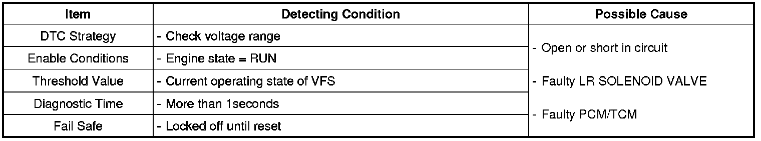 The TCM checks the VFS Control Signal by monitoring the feedback signal from the solenoid valve drive circuit. If an unexpected signal is monitored (for example, high voltage is detected when low voltage is expected, or low voltage is detected when high voltage is expected), the TCM judges that the Low and Reverse control solenoid circuit is malfunctioning and sets this code.
