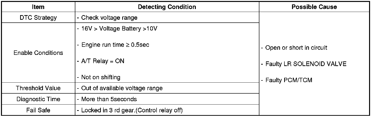 The TCM checks the Low and Reverse Control Signal by monitoring the feedback signal from the solenoid valve drive circuit. If an unexpected signal is monitored (for example, high voltage is detected when low voltage is expected, or low voltage is detected when high voltage is expected), the TCM judges that the Low and Reverse control solenoid circuit is malfunctioning and sets this code.
