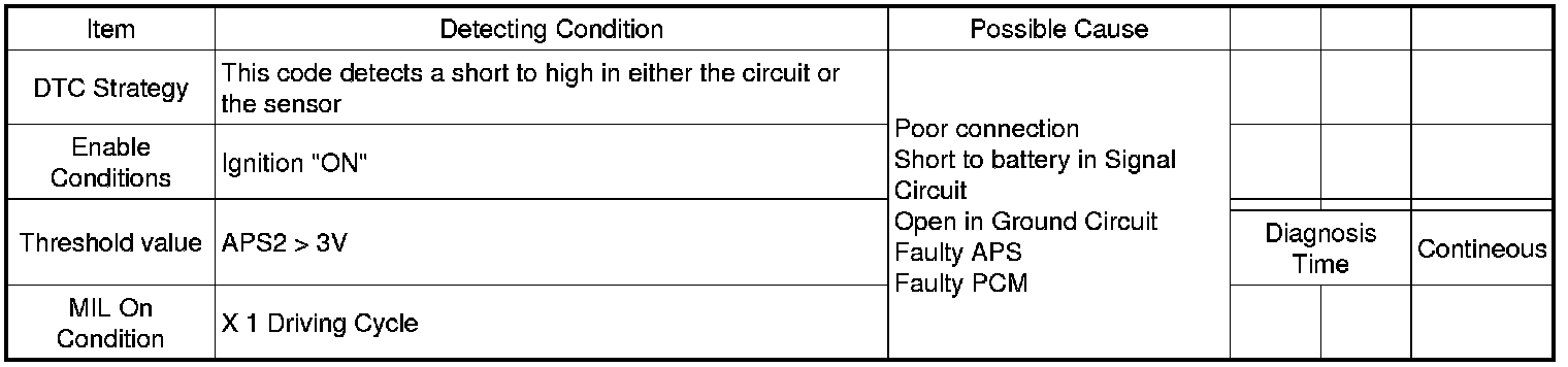 Checking output signals from APS 2 under detecting condition, if output signals are above the threshold. PCM sets P2128. MIL (Malfunction Indication Lamp) turns on when the malfunction lasts till 1 driving cycle.