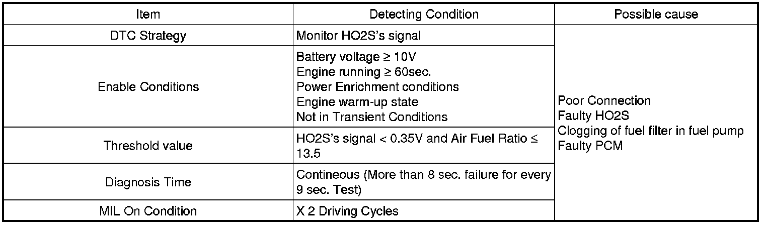 Checking output signals from HO2S under detecting condition, if HO2S's signal is lean during power enrichment conditions, PCM sets P2195. MIL (Malfunction Indication Lamp) turns on when the malfunction lasts till consecutive 2 driving cycles.