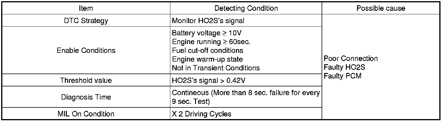 Checking output signals from HO2S under detecting condition, if HO2S's signal is rich during fuel cut-off conditions, PCM sets P2196. MIL (Malfunction Indication Lamp) turns on when the malfunction lasts till consecutive 2 driving cycles.