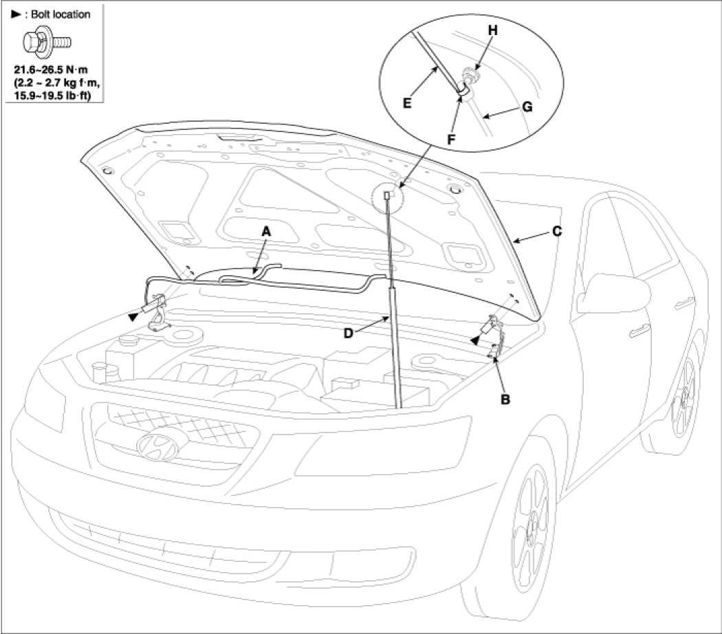 2. After loose the hood hinge (B) mounting bolts,