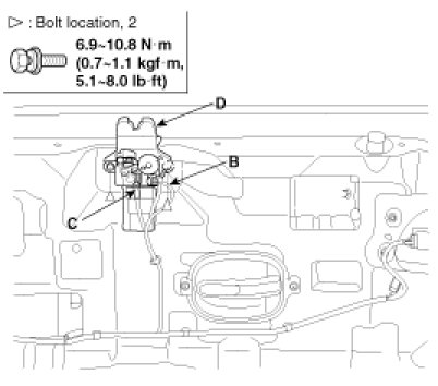 3. After loosening the mounting bolt, then remove the latch assembly (D).