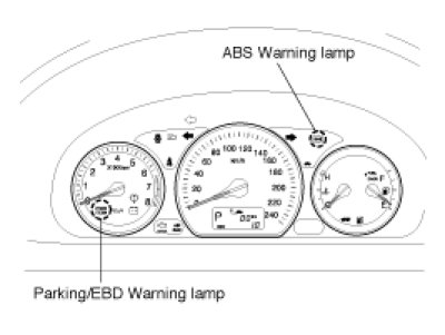 The active EBD warning lamp module indicates the selftest and failure status of the EBD.However, in case the Parking Brake Switch is turned on, the EBD warning lamp is always turned on regardless of EBD functions.The EBD warning lamp shall be on:
