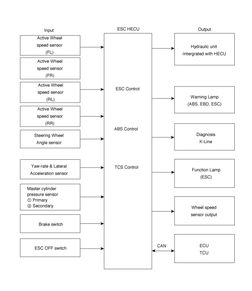 ABS/EBD function The ECU changes the active sensor signal (current shift) coming from the four wheel sensors to the square wave.By using the input of above signals,the ECU calculates the vehicle speed and the acceleration & deceleration of the four wheels.And, the ECU judges whether the ABS/EBD should be actuated or not.