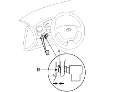 1. With the engine off, inspect the pedal free play (A) on the pedal pad (B) by pushing the pedal by hand.