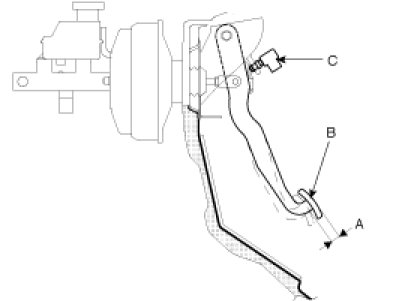 2. If the pedal free play is out of specification, adjust the brake switch (C). If the pedal free play is insufficient, it may result in brake drag.