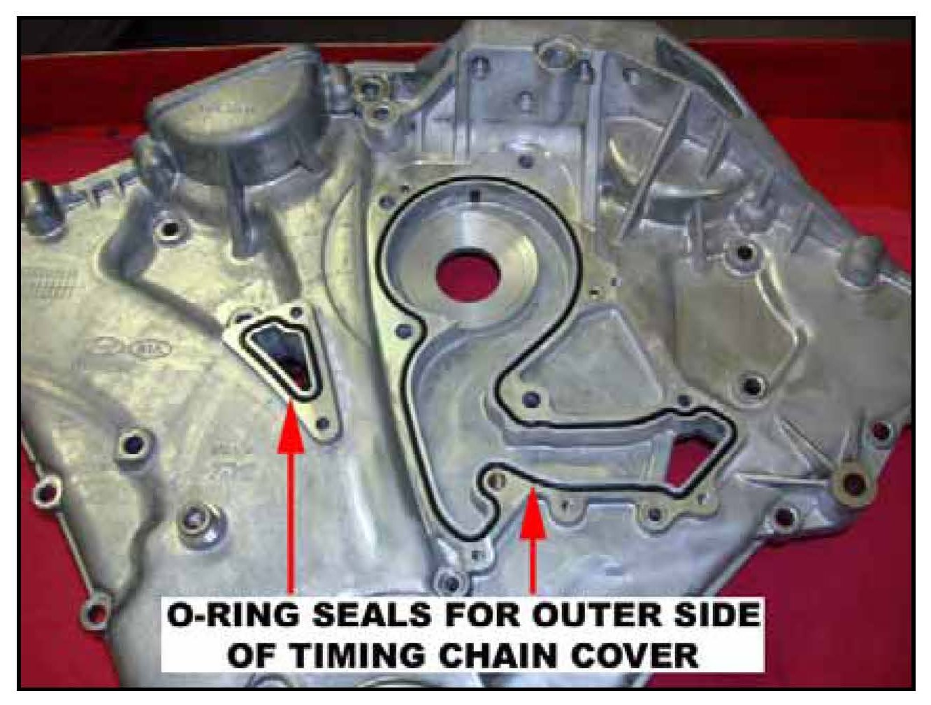 34. Install new rubber o-ring and gaskets to the front and back sealing recesses of the timing chain cover.