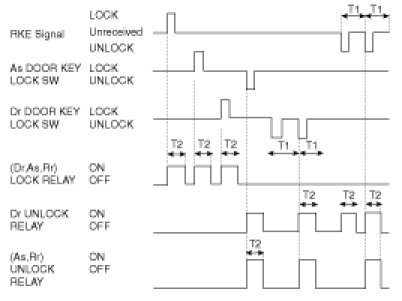 (2) Driver door unlock signal is output for T2 when RKE UNLOCK signal is received. But, all door unlock signals are output for T2 if RKE UNLOCK signal is received within T1.