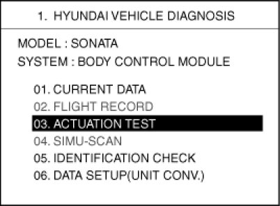 4. To perform compulsory operation on BCM input factors, select "03. ACTUATION TEST"