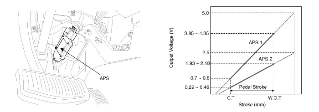 Accelerator Position Sensor (APS) is installed on the accelerator pedal module and detects the rotation angle of the accelerator pedal. The APS is one of the most important sensors in engine control system, so it consists of the two sensors which adapt individual sensor power and ground line. The second sensor monitors the first sensor and its output voltage is half of the first one. If the ratio of the sensor 1 and 2 is out of the range (approximately 1/2), the diagnostic system judges that it is abnormal.