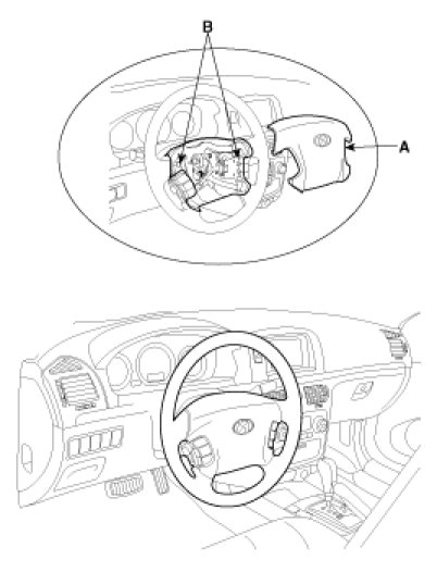 3. Disconnect the connectors(A) after lifting up the pin (D) and the horn connector(B). Remove the driver's airbag(C) from the steering wheel.
