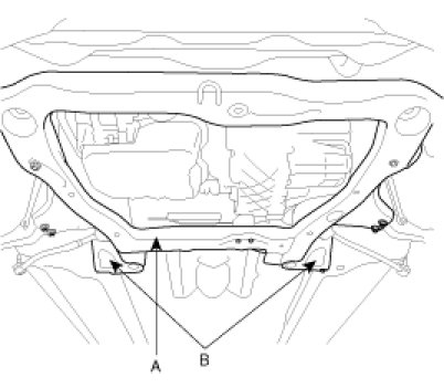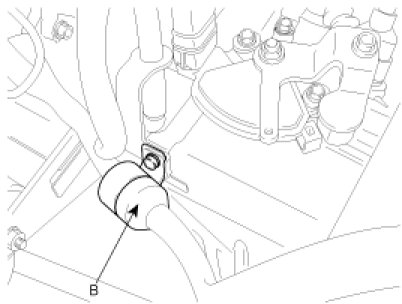 24. Supporting the cross member(A) with a jack, remove the stays(B) with the mounting bolts.