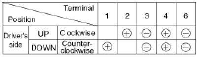 3. Connect the motor terminals directly to battery voltage (12V) and check that the motor operates smoothly. Next, reverse the polarity and check that the motor operates smoothly in the reverse direction. If the operation is abnormal, replace the motor.