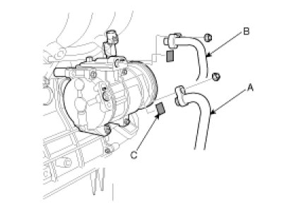 5. Remove the bolts, then disconnect the suction line (A) and discharge line (B) from the compressor. Plug (C) or cap the lines immediately after disconnecting them to avoid moisture and dust contamination.