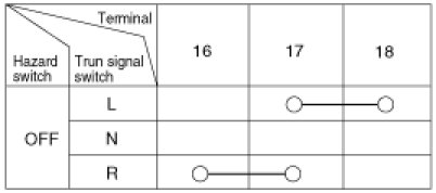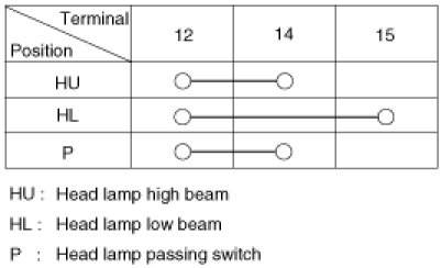 With the multi function switch in each position, make sure that continuity exists between the terminals below. If continuity is not as specified, replace the multi-function switch.