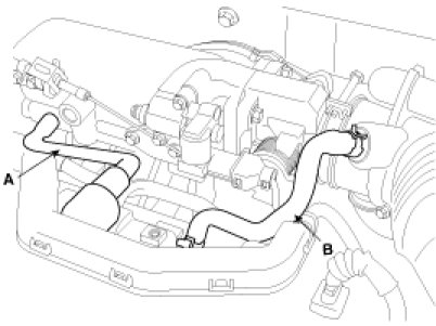 (3) Install the PCV(Positive Crankcase Ventilation) hose(A) and breather hose(B) to the cylinder head cover.