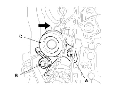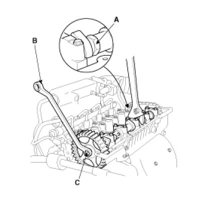 (1) Hold the portion(A) of the camshaft with a hexagonal wrench, and remove the bolt(C) with a wrench(B) and remove the camshaft sprocket.