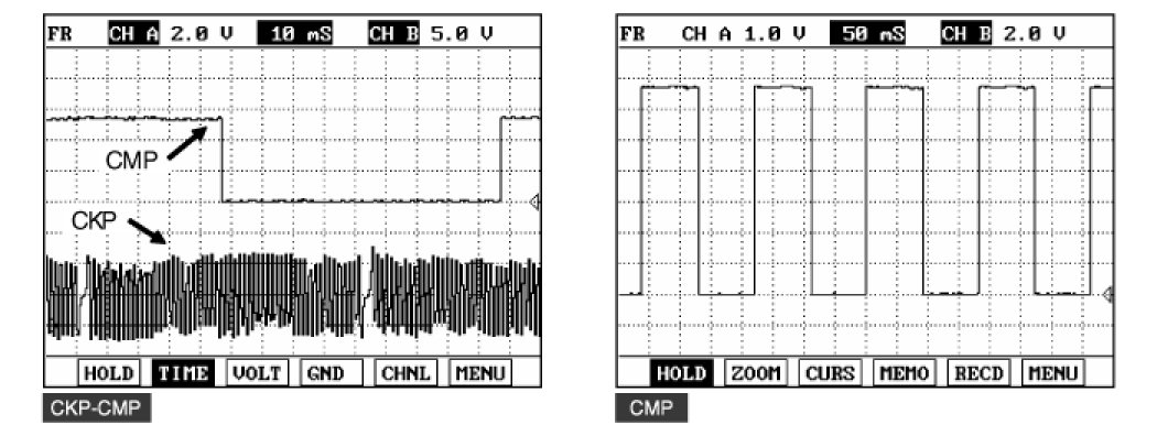 This example shows a typical Crankshaft Position Sensor(CKPS) and Camshaft Position Sensor(CMPS) waveform at idle.