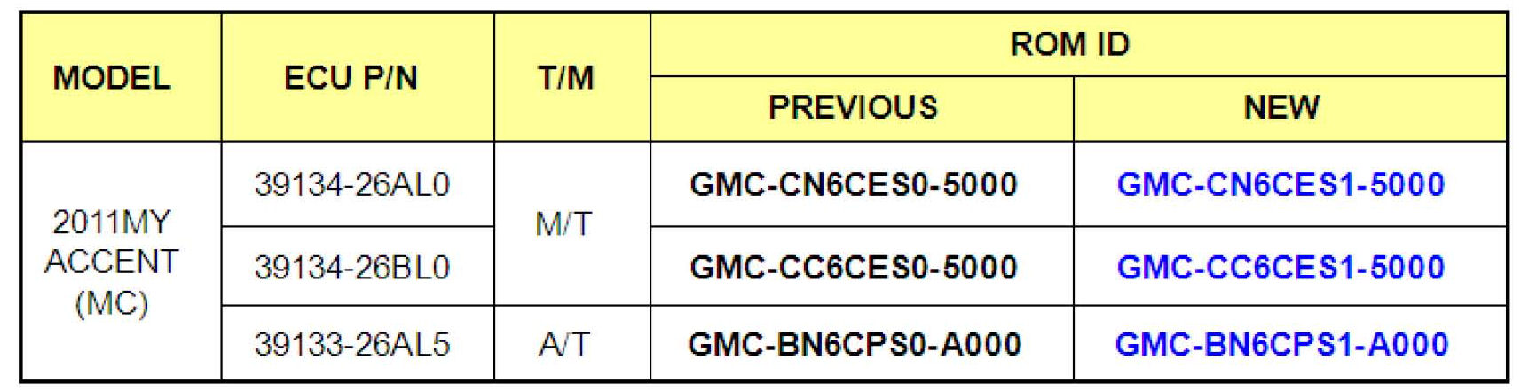This bulletin provides the procedure to update the Engine Control Module (ECM) of some 2011 MY ACCENT (MC) vehicles to address the following ECM (Electronic Control Module) system-related DTCs: