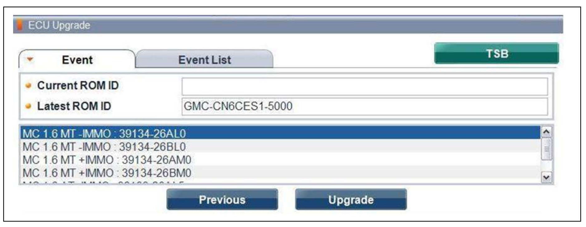 7. After the Current ROM ID is displayed, select the Update Event "220.MC 1.6 P0128, P0461 DTC LOGIC IMPROVEMENT."